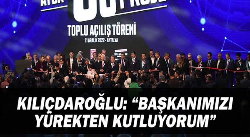 Antalya Büyükşehir Belediye Başkanı Muhittin Böcek’in tarım ve yerelden kalkınma projelerinden, alt yapı çalışmalarına, sağlık ve sosyal yardımlaşmadan çevre ve sürdürülebilirlik projelerine kadar Antalya’ya kazandırdığı 80 imza proje için Cam Piramit’te “Antalya ikinci yüzyıla hazır” başlığıyla toplu açılış töreni düzenlendi. Törene, CHP Genel Başkanı Kemal Kılıçdaroğlu, CHP ve İYİ Parti Genel Başkan Yardımcıları, Milletvekilleri, ilçe belediye başkanları, Millet İttifakının İl ve İlçe Başkanları, meclis üyeleri, muhtarlar, STK’lar ve vatandaşlar katıldı. CHP Genel Başkanı Kılıçdaroğlu, tören alanına alkışlar ve tezahüratlarla girdi.