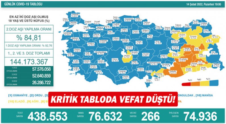 Sağlık Bakanlığı, 14 Şubat Corona virüs tablosunu paylaştı. Açıklanan tabloya göre son 24 saatte yapılan 438 bin 553 testte 76 bin 632 vaka tespit edildi. Koronavirüs nedeniyle 266 kişi hayatını kaybederken, 74 bin 936 kişinin de tedavisi ve karantinası sona erdi.