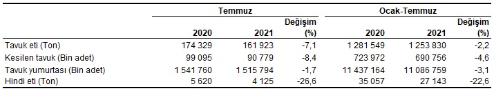 Temmuz ayında bir önceki yılın aynı ayına göre tavuk yumurtası üretimi %1,7, tavuk eti üretimi %7,1, kesilen tavuk sayısı %8,4, hindi eti üretimi ise %26,6 azaldı. Ocak-Temmuz döneminde bir önceki yılın aynı dönemine göre tavuk eti üretimi %2,2, tavuk yumurtası üretimi %3,1, kesilen tavuk sayısı %4,6, hindi eti üretimi ise %22,6 azaldı.