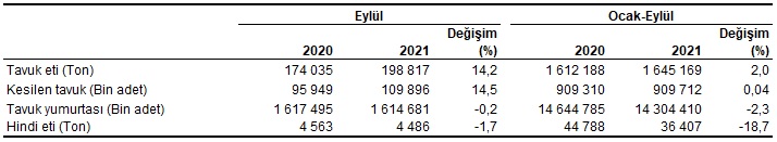Ocak-Eylül döneminde bir önceki yılın aynı dönemine göre tavuk eti üretimi %2, kesilen tavuk sayısı %0,04 artarken tavuk yumurtası üretimi %2,3, hindi eti üretimi %18,7 azaldı.