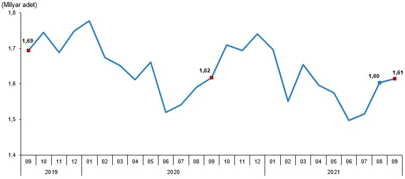 Eylül ayında bir önceki aya göre tavuk yumurtası üretimi %0,7 artarak 1,61 milyar adet oldu.