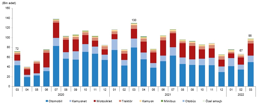Trafiğe kaydı yapılan taşıt sayısı, Mart 2020-Mart 2022