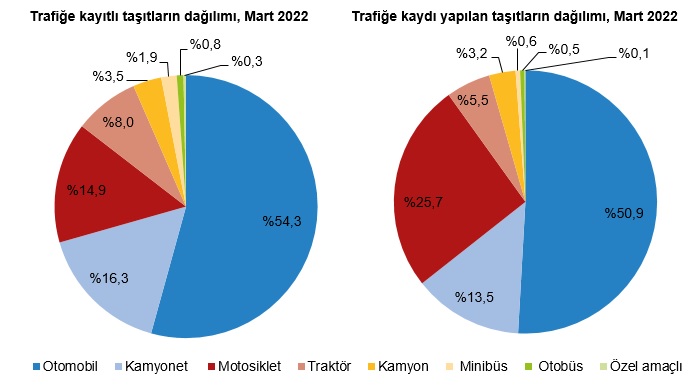 Mart ayı sonu itibarıyla trafiğe kayıtlı taşıtların %54,3'ünü otomobil, %16,3'ünü kamyonet, %14,9'unu motosiklet, %8,0'ını traktör, %3,5'ini kamyon, %1,9'unu minibüs, %0,8'ini otobüs ve %0,3'ünü özel amaçlı taşıtlar oluşturdu.