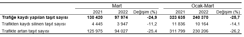 Ocak-Mart döneminde bir önceki yılın aynı dönemine göre trafiğe kaydı yapılan taşıt sayısı %25,7 azalarak 240 bin 370 adet olurken, trafikten kaydı silinen taşıt sayısı %14,1 azalarak 10 bin 164 adet oldu. Böylece Ocak-Mart döneminde trafikteki toplam taşıt sayısında 230 bin 206 adet artış gerçekleşti.