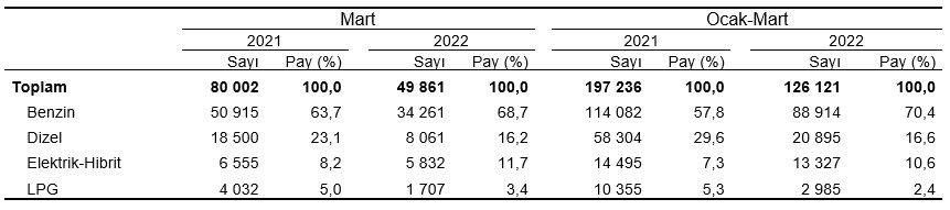Ocak-Mart döneminde trafiğe kaydı yapılan 126 bin 121 adet otomobilin %70,4'ü benzin, %16,6'sı dizel, %10,6'sı elektrikli veya hibrit olup %2,4'ü LPG yakıtlıdır. Mart ayı sonu itibarıyla trafiğe kayıtlı 13 milyon 831 bin 96 adet otomobilin ise %37,4'ü dizel, %35,7'si LPG, %25,8'i benzin yakıtlı olup, %0,8'i elektrikli veya hibrittir. Yakıt türü bilinmeyen(2) otomobillerin oranı ise %0,3'tür.