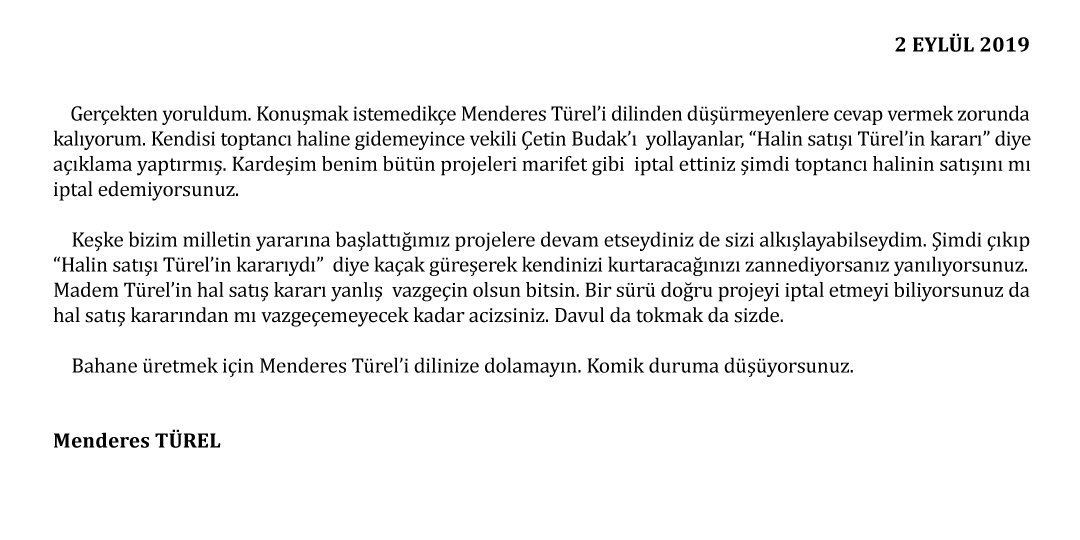 CHP'li Milletvekili Çetin Osman Budak'ın esnafa yapmış olduğu açıklamanın ardından bir açıklama da Menderes Türel'den geldi. Türel, yaptığı açıklamasında kendi döneminde planlanan birçok projenin yeni yönetim tarafından iptali gerçekleştirebiliyorken halde satışlara devam edildiğine dikkat çekti. Açıklamasında yeni yönetimi kaçak güreşmekle suçlayan Türel, 'Bahane üretmek için Menders Türel'i dilinize dolamayın' dedi