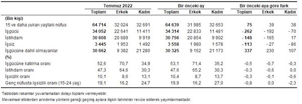 İşgücü 2022 yılı Temmuz ayında bir önceki aya göre 262 bin kişi azalarak 34 milyon 52 bin kişi, işgücüne katılma oranı ise 0,5 puanlık azalış ile %52,6 olarak gerçekleşti. İşgücüne katılma oranı erkeklerde %70,7, kadınlarda ise %34,9 oldu.