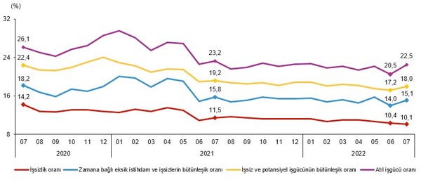Zamana bağlı eksik istihdam, potansiyel işgücü ve işsizlerden oluşan atıl işgücü oranı 2022 yılı Temmuz ayında bir önceki aya göre 2,0 puan artarak %22,5 oldu. Zamana bağlı eksik istihdam ve işsizlerin bütünleşik oranı %15,1 iken potansiyel işgücü ve işsizlerin bütünleşik oranı %18,0 olarak tahmin edildi.