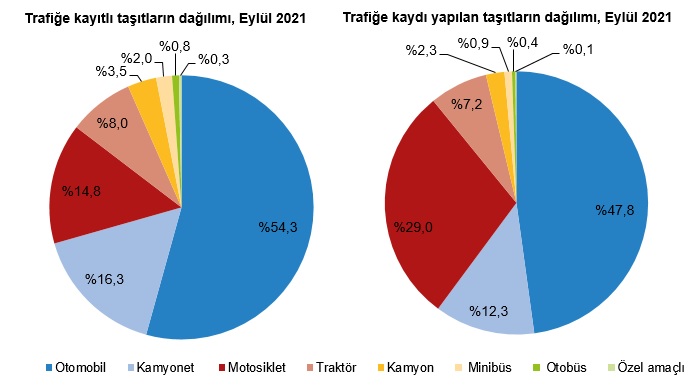 Eylül ayında trafiğe kaydı yapılan taşıtların %47,8'ini otomobil, %29,0'ını motosiklet, %12,3'ünü kamyonet, %7,2'sini traktör, %2,3'ünü kamyon, %0,9'unu minibüs, %0,4'ünü otobüs ve %0,1'ini özel amaçlı taşıtlar oluşturdu.