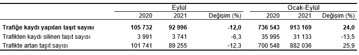 Ocak-Eylül döneminde bir önceki yılın aynı dönemine göre trafiğe kaydı yapılan taşıt sayısı %24,0 artarak 913 bin 169 adet olurken, trafikten kaydı silinen taşıt sayısı %13,5 azalarak 31 bin 133 adet oldu. Böylece Ocak-Eylül döneminde trafikteki toplam taşıt sayısında 882 bin 36 adet artış gerçekleşti.