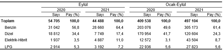 Ocak-Eylül döneminde trafiğe kaydı yapılan 497 bin 104 adet otomobilin %61,4'ü benzin, %24,3'ü dizel, %8,7'si elektrikli veya hibrit olup %5,6'sı LPG yakıtlıdır. Eylül ayı sonu itibarıyla trafiğe kayıtlı 13 milyon 591 bin 103 adet otomobilin ise %37,8'i dizel, %36,1'i LPG, %25,3'ü benzin yakıtlı olup, %0,6'sı elektrikli veya hibrittir. Yakıt türü bilinmeyen(2) otomobillerin oranı ise %0,3'tür.