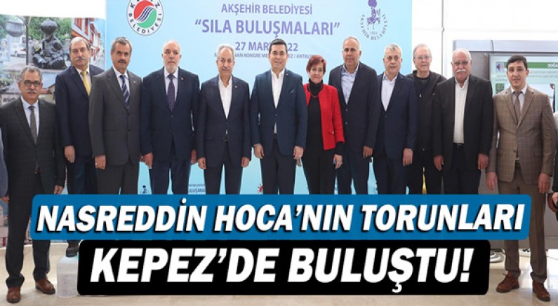Nasreddin Hoca’nın torunları Kepez’de bir araya geldi. Akşehir Belediyesi Sıla Buluşmaları, Kepez Belediyesinin katkıları, Akşehiri Sevenler Derneği’nin(AKSEVDER) işbirliğiyle düzenlendi. Mimar Sinan Kongre Merkezi’ndeki ‘Sıla Buluşmaları’na Akşehir Belediye Başkanı Dr. Salih Akkaya, Kepez Belediye Başkanı Hakan Tütüncü, Antalya Akşehiri Sevenler Derneği Başkanı Tuncay Kesim ve çok sayıda Akşehirli katıldı. Nasreddin Hoca’nın torunları bir araya gelmenin mutluluğunu yaşadıkları etkinlikte gönüllerince eğlenme fırsatı buldular. Sıla Buluşmalarına katılan Kepez Belediye Başkanı Hakan Tütüncü, Akşehir Belediyesi’nin Kepez Belediyesi’nin ilk kardeş belediyesi olduğunu belirterek, “Akşehir bizim medeniyetimizin en önemli merkezi, Konya kadim Türk tarihinin en önemli başkentlerinden birisidir. Konya’nın hangi ilçesine giderseniz gidin sizi iki hakikat karşılar. Köklü Türk tarihinin izleri, manevi önderlerin bıraktığı silinmez izler.” dedi.