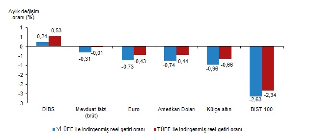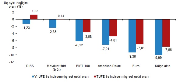 DİBS, üç aylık değerlendirmede; TÜFE ile indirgendiğinde %1,32 oranında yatırımcısına en yüksek reel getiri sağlayan yatırım aracı olurken; Yİ-ÜFE ile indirgendiğinde ise %1,23 oranında yatırımcısına kaybettirdi. Külçe altın, Yİ-ÜFE ile indirgendiğinde %9,99, TÜFE ile indirgendiğinde ise %7,66 oranında yatırımcısına en çok kaybettiren yatırım aracı oldu.