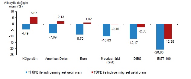 Altı aylık değerlendirmeye göre külçe altın; TÜFE ile indirgendiğinde %5,67 oranında yatırımcısına en yüksek reel getiri sağlarken; Yİ-ÜFE ile indirgendiğinde ise %4,49 oranında yatırımcısına kaybettirmiştir. Aynı dönemde BIST 100 endeksi, Yİ-ÜFE ile indirgendiğinde %20,80, TÜFE ile indirgendiğinde ise %12,38 oranında yatırımcısına en çok kaybettiren yatırım aracı oldu.