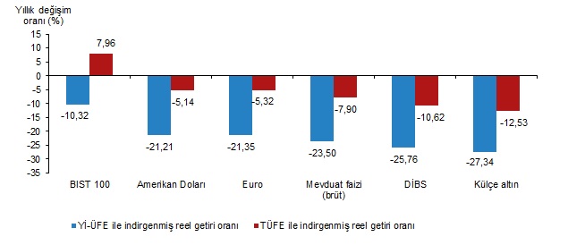Yıllık değerlendirmede, Yİ-ÜFE ile indirgendiğinde; yatırım araçlarından Amerikan doları %21,21, Euro %21,35, mevduat faizi (brüt) %23,50, DİBS %25,76 ve külçe altın %27,34 oranlarında yatırımcısına kaybettirmiştir. TÜFE ile indirgendiğinde Amerikan doları %5,14, Euro %5,32, mevduat faizi (brüt) %7,90, DİBS %10,62 ve külçe altın %12,53 oranlarında yatırımcısına kaybettirmiştir.