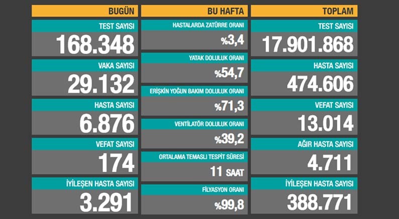 Semptom gösteren 6 bin 876 kişiyle birlikte toplam 29 bin 132 yeni vaka tespit edildi. Türkiyede toplam hasta sayısı 474 bin 606 oldu.