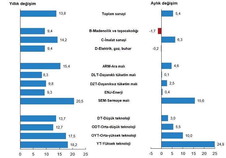 Sanayinin alt sektörleri (2015=100 referans yıllı) incelendiğinde, 2021 yılı Ağustos ayında madencilik ve taşocakçılığı sektörü endeksi bir önceki yılın aynı ayına göre %9,4, imalat sanayi sektörü endeksi %14,2 ve elektrik, gaz, buhar ve iklimlendirme üretimi ve dağıtımı sektörü endeksi %9,4 arttı.