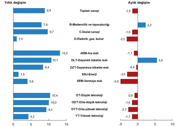 Sanayinin alt sektörleri incelendiğinde, 2021 yılı Eylül ayında madencilik ve taşocakçılığı sektörü endeksi bir önceki aya göre %2,2 artarken, imalat sanayi sektörü endeksi %1,6 ve elektrik, gaz, buhar ve iklimlendirme üretimi ve dağıtımı sektörü endeksi %3,2 azaldı.