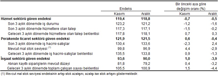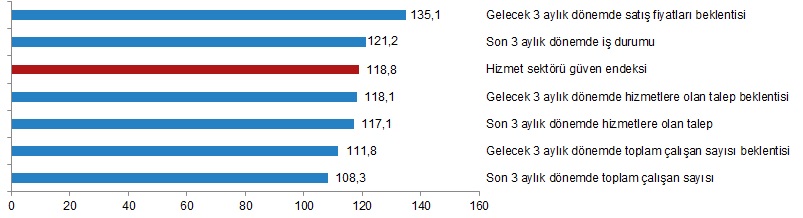 Mevsim etkilerinden arındırılmış hizmet sektörü güven endeksi Kasım ayında 119,4 iken, Aralık ayında %0,5 oranında azalarak 118,8 değerini aldı. Hizmet sektöründe bir önceki aya göre, son üç aylık dönemde iş durumu alt endeksi %1,6 azalarak 121,2 oldu. Son üç aylık dönemde hizmetlere olan talep alt endeksi %0,2 azalarak 117,1 değerini aldı. Gelecek üç aylık dönemde hizmetlere olan talep beklentisi alt endeksi ise %0,3 artarak 118,1 oldu.