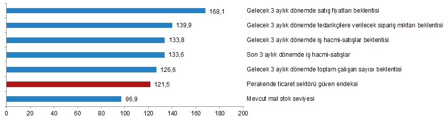 Mevsim etkilerinden arındırılmış perakende ticaret sektörü güven endeksi Aralık ayında %0,4 oranında azalarak 121,5 değerini aldı. Perakende ticaret sektöründe bir önceki aya göre, son üç aylık dönemde iş hacmi satışlar alt endeksi %2,4 artarak 133,6 oldu. Mevcut mal stok seviyesi alt endeksi %2,9 azalarak 96,9 değerini aldı. Gelecek üç aylık dönemde iş hacmi-satışlar beklentisi alt endeksi ise %1,3 azalarak 133,8 oldu.