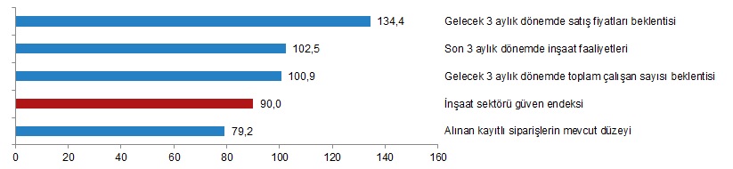 Mevsim etkilerinden arındırılmış inşaat sektörü güven endeksi bir önceki ayda 93,6 iken, Aralık ayında %3,9 oranında azalarak 90,0 değerini aldı. İnşaat sektöründe bir önceki aya göre, alınan kayıtlı siparişlerin mevcut düzeyi alt endeksi %3,2 azalarak 79,2 oldu. Gelecek üç aylık dönemde toplam çalışan sayısı beklentisi alt endeksi ise %4,4 azalarak 100,9 değerini aldı.