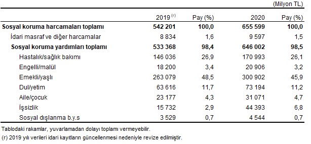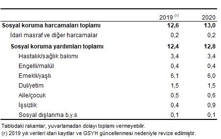 Sosyal koruma harcamalarının gayrisafi yurt içi hasıla (GSYH) içindeki payı 2020 yılında %13,0 oldu. Sosyal koruma yardımlarının GSYH içindeki payı ise %12,8 olarak gerçekleşti. Risk/ihtiyaç grupları bazında bakıldığında, emekli/yaşlılara yapılan harcamaların %6,0 ile en büyük paya sahip olduğu görüldü. Bunu, %3,4 ile hastalık/sağlık bakımı harcamaları ve %1,5 ile dul/yetim harcamaları takip etti.