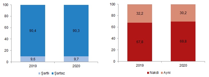 Şartlı yardımlar içinde en büyük payı %45,1 ile aile/çocuk yardımları oluşturdu. Bunu %26,0 ile engelli/malül yardımları ve %11,2 ile hastalık/sağlık bakımı yardımları takip etti.