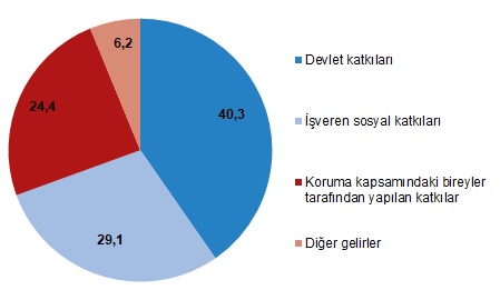 Sosyal koruma gelirlerinin %40,3'ünü devlet katkıları, %29,1'ini işveren sosyal katkıları ve %24,4'ünü koruma kapsamındaki bireyler tarafından yapılan sosyal katkılar oluşturdu.
