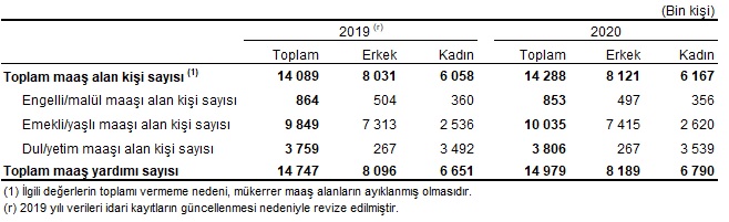 Ülkemizde sosyal koruma kapsamında emekli/yaşlı, dul/yetim ve engelli/malül maaşı alan kişi sayısı 2019 yılında 14 milyon 89 bin iken, %1,4 artarak 2020 yılında 14 milyon 288 bin kişiye yükseldi. Sosyal koruma kapsamında maaş yardımı sayısı 2019 yılında 14 milyon 747 bin iken, 2020 yılında 14 milyon 979 bine yükseldi.