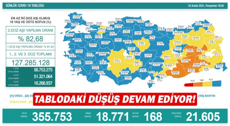 18 yaş üstü nüfusta ikinci doz aşı uygulananların oranı yüzde 82,68, birinci doz aşı yapılanların oranı yüzde 91,43 olarak gerçekleşti.
