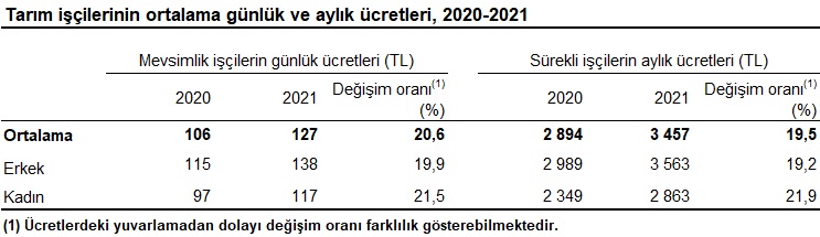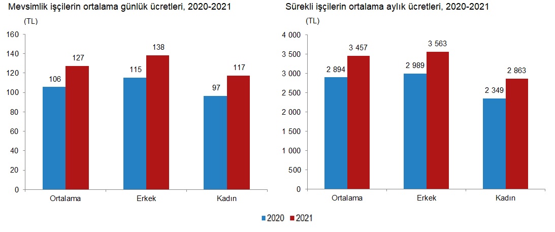 2020 yılında 115 TL olan mevsimlik erkek işçi ücretleri %19,9 artış göstererek 2021 yılında 138 TL olurken, kadın işçilerin günlük ücretleri ise %21,5 artış göstererek 97 TL'den 117 TL'ye yükseldi.