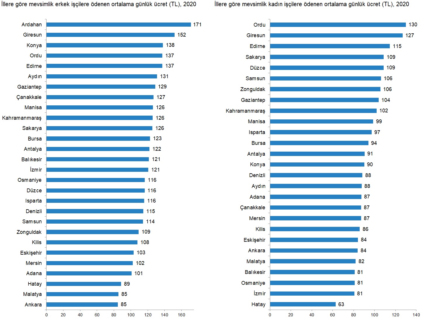 2020 yılında tarımsal işletmelerde mevsimlik tarım işçilerine yapılan en yüksek günlük ücret ödemesi erkek işçiler için 171 TL ile Ardahan ilinde, kadın işçiler için 130 TL ile Ordu ilinde gerçekleşti. En düşük ücret ödemesi ise erkek işçiler için 85 TL ile Malatya ve Ankara illerinde, kadın işçiler için ise 63 TL ile Hatay ilinde gerçekleşti.
