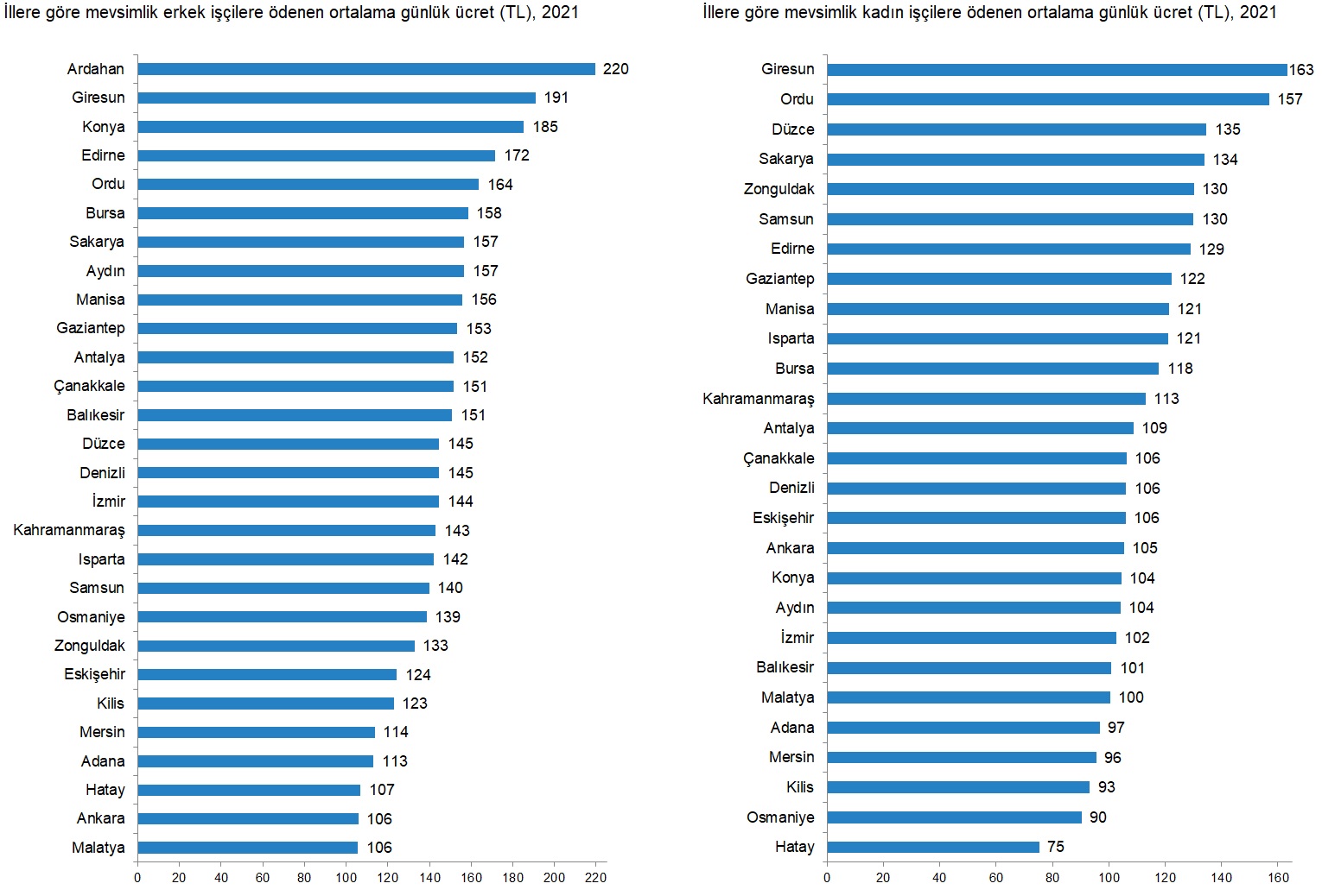 2021 yılı için ise en yüksek günlük ücret ödemesi erkek işçiler için 220 TL ile Ardahan ilinde, kadın işçiler için 163 TL ile Giresun ilinde gerçekleşti. En düşük ücret ödemesi ise erkek işçiler için 106 TL ile Malatya ve Ankara illerinde, kadın işçiler için ise 75 TL ile Hatay ilinde gerçekleşti.