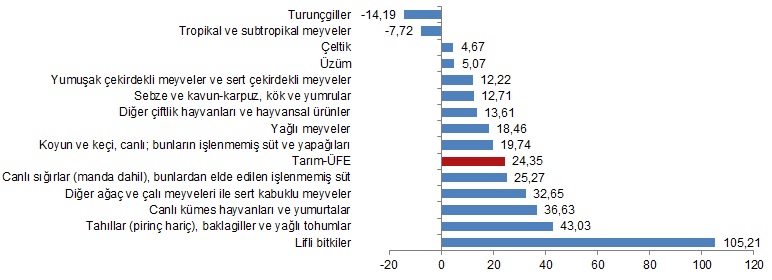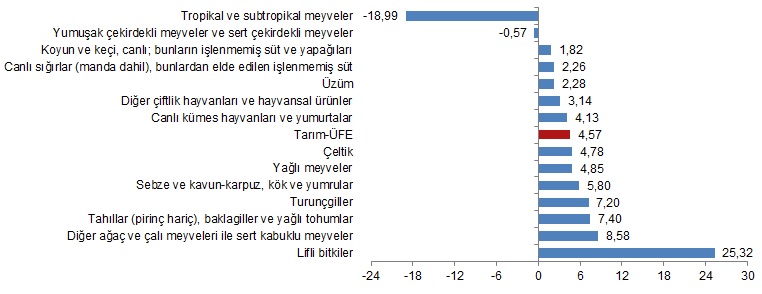 Yıllık artışın düşük olduğu alt gruplar sırasıyla, %4,67 ile çeltik ve %5,07 ile üzüm oldu. Buna karşılık, yıllık artışın yüksek olduğu alt gruplar ise sırasıyla, %105,21 ile lifli bitkiler, %43,03 ile tahıllar (pirinç hariç), baklagiller ve yağlı tohumlar ve %36,63 ile canlı kümes hayvanları ve yumurtalar oldu. Bir önceki yılın aynı ayına göre en fazla azalış gösteren alt grup ise %14,19 ile turunçgiller oldu.
