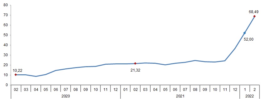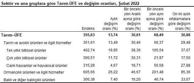 Tarım-ÜFE yıllık değişim oranı (%), Şubat 2022