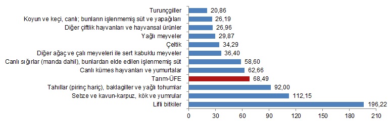 Yıllık artışın düşük olduğu alt gruplar sırasıyla, %20,86 ile turunçgiller ve %26,19 ile koyun ve keçi, canlı; bunların işlenmemiş süt ve yapağıları oldu. Buna karşılık, yıllık artışın yüksek olduğu alt gruplar ise sırasıyla, %196,22 ile lifli bitkiler, %112,15 ile sebze ve kavun-karpuz, kök ve yumrular ve %92,00 ile tahıllar (pirinç hariç), baklagiller ve yağlı tohumlar oldu.