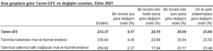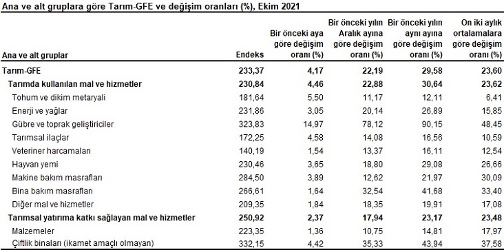 Ana gruplarda bir önceki aya göre tarımsal yatırıma katkı sağlayan mal ve hizmet endeksinde %2,37, tarımda kullanılan mal ve hizmet endeksinde %4,46 artış gerçekleşti. Bir önceki yılın aynı ayına göre göre tarımsal yatırıma katkı sağlayan mal ve hizmet endeksinde %23,17, tarımda kullanılan mal ve hizmet endeksinde %30,64 artış gerçekleşti.