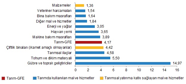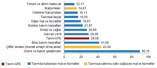 Yıllık artışın düşük olduğu alt gruplar sırasıyla, %12,11 ile tohum ve dikim materyali ve %14,81 ile malzemeler oldu. Buna karşılık, yıllık artışın yüksek olduğu alt gruplar ise sırasıyla, %90,15 ile gübre ve toprak geliştiriciler ve %43,94 ile çiftlik binaları (ikamet amaçlı olmayanlar) oldu.