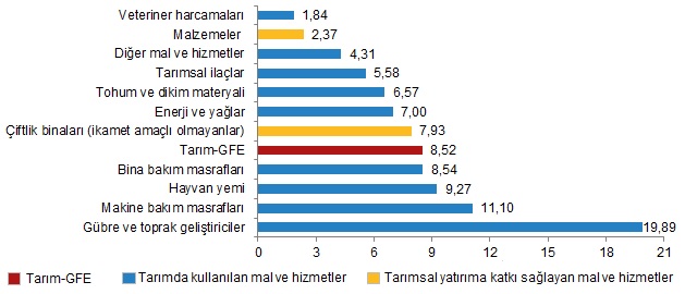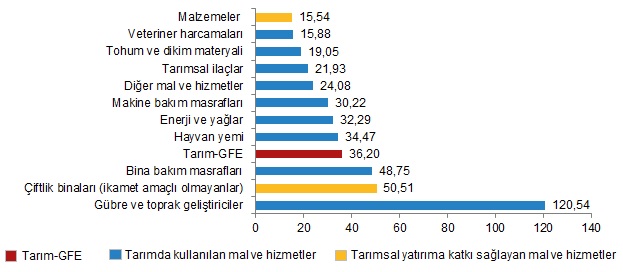 Yıllık artışın düşük olduğu alt gruplar sırasıyla, %15,54 ile malzemeler ve %15,88 ile veteriner harcamaları oldu. Buna karşılık, yıllık artışın yüksek olduğu alt gruplar ise sırasıyla, %120,54 ile gübre ve toprak geliştiriciler ve %50,51 ile çiftlik binaları (ikamet amaçlı olmayanlar) oldu.