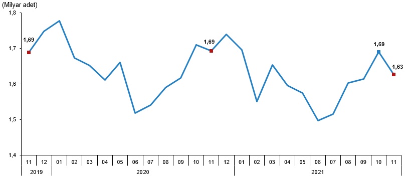 Kasım ayında bir önceki aya göre tavuk yumurtası üretimi %3,7 azalarak 1,63 milyar adet oldu.
