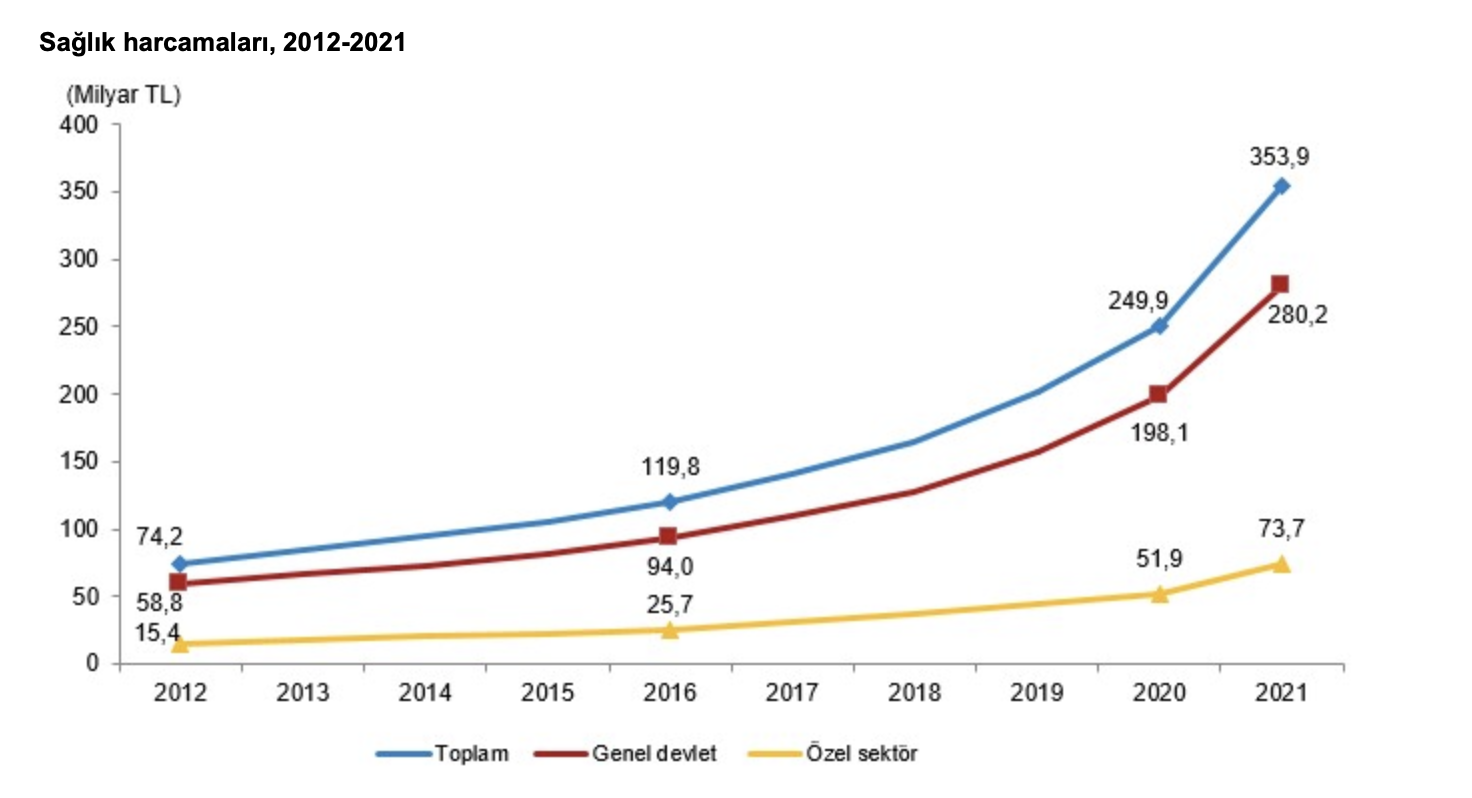 Cari sağlık harcaması 2021 yılında bir önceki yıla göre %42,0 artarak 330 milyar 928 milyon TL'ye yükseldi. Sağlık harcamaları kapsamındaki yatırımlar %36,4 artarak 23 milyar 13 milyon TL'ye ulaştı.