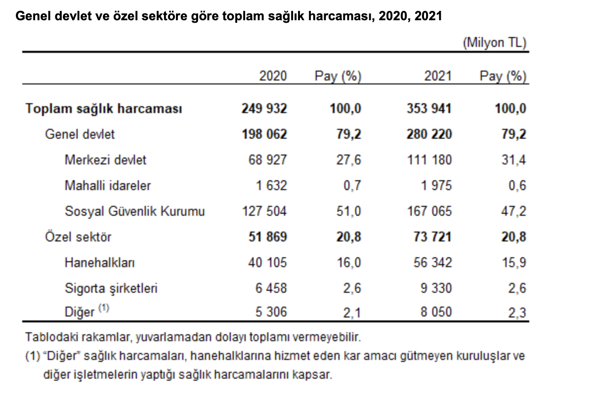 Hanehalkları tarafından tedavi, ilaç vb. amaçlı yapılan cepten sağlık harcaması 2021 yılında bir önceki yıla göre %40,5 artarak 56 milyar 342 milyon TL'ye ulaştı. Hanehalkı cepten sağlık harcamasının toplam sağlık harcamasına oranı 2021 yılında %15,9 olarak gerçekleşti.