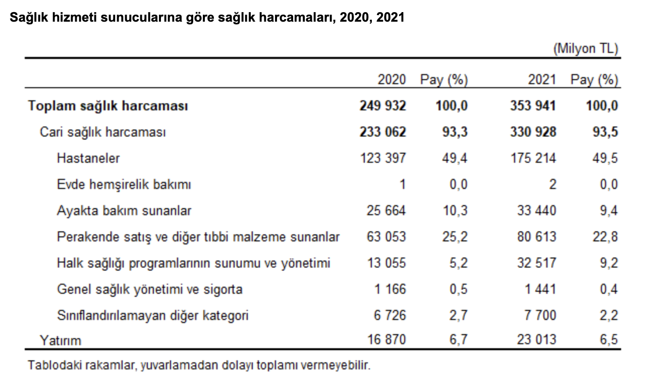 Toplam sağlık harcamasının sağlık hizmeti sunucularına göre dağılımı incelendiğinde, ilk üç sıra 2021 yılında da değişmedi. Sağlık hizmetleri ve ürünleri satın almak için başvurulan sağlık kurumları içerisinde en büyük payı 2021 yılında %49,5 ile hastaneler oluşturdu. Hastaneleri sırasıyla %22,8 ile perakende satış ve diğer tıbbi malzeme sunanlar ve %9,4 ile ayakta bakım sunanlar izledi.