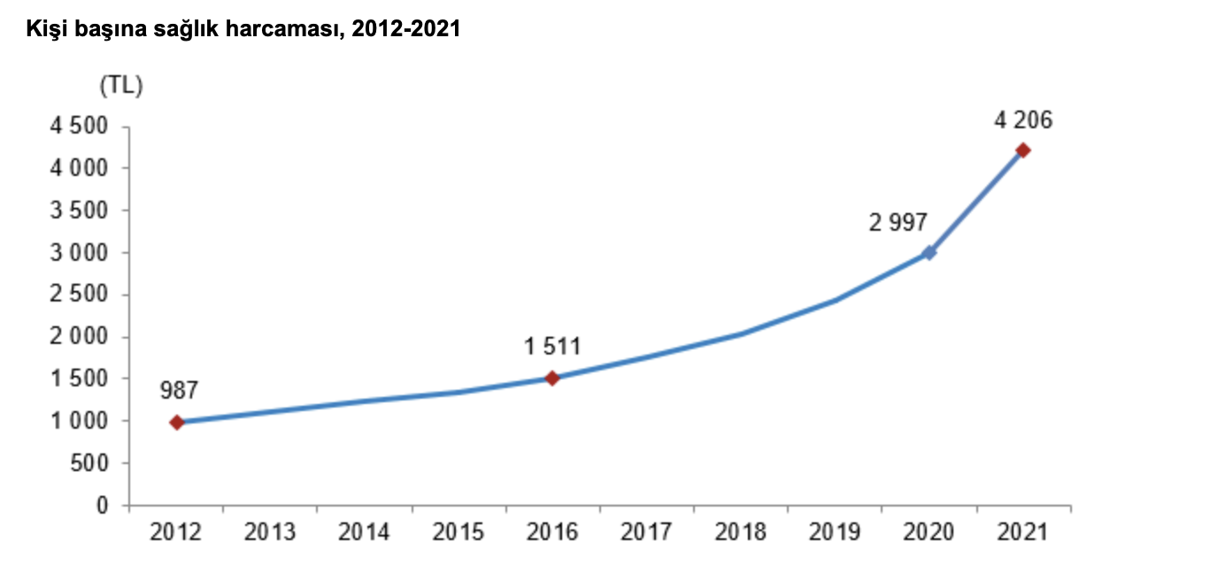 Kişi başına sağlık harcaması 2020 yılında 2 bin 997 TL iken, 2021 yılında %40,3 artarak 4 bin 206 TL'ye yükseldi.