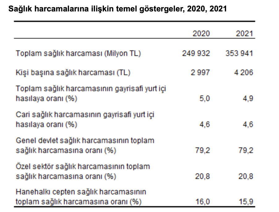 Toplam sağlık harcamasının GSYH'ye oranı 2020 yılında %5,0 iken, 2021 yılında %4,9 oldu. Cari sağlık harcamasının GSYH'ye oranı ise 2020 ve 2021 yıllarında %4,6 olarak gerçekleşti.