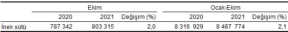 Ekim ayında bir önceki yılın aynı ayına göre ticari süt işletmeleri tarafından yapılan içme sütü üretimi %3,1 artarak 137 bin 195 ton olarak gerçekleşti. Ocak-Ekim döneminde bir önceki yılın aynı dönemine göre içme sütü üretimi %5,3 azalarak 1 milyon 263 bin 619 ton olarak gerçekleşti.