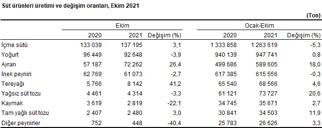 Ekim ayında bir önceki yılın aynı ayına göre, tereyağı üretimi %41,2, ayran üretimi %26,4, tam yağlı süt tozu üretimi %3 artarken, inek peyniri üretimi %2,7, yağsız süt tozu üretimi %3,3, kaymak üretimi %22,1, diğer peynirler (koyun, keçi, manda ve karışık sütlerden elde edilen peynir çeşitleri) %40,4 azalmıştır.