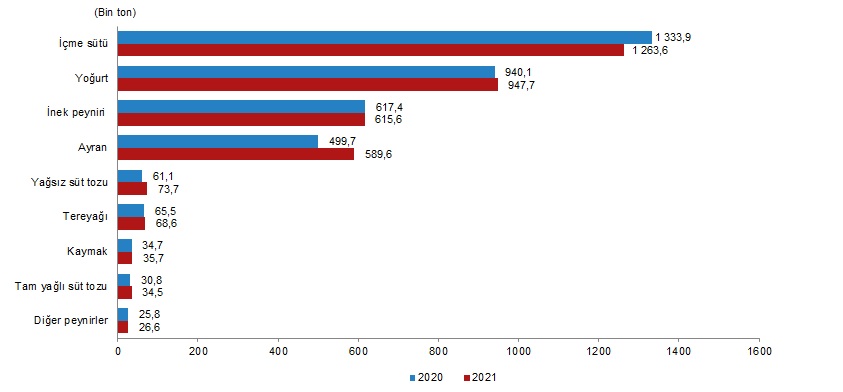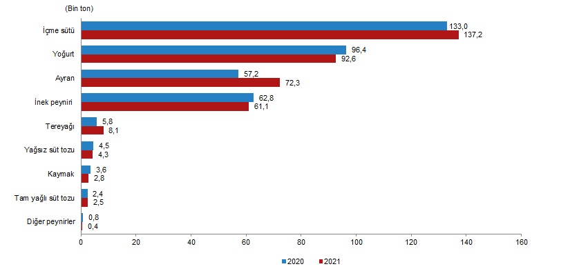 Ocak-Ekim döneminde bir önceki yılın aynı dönemine göre yağsız süt tozu üretimi %20,6, ayran üretimi %18, tam yağlı süt tozu üretimi %11,9, tereyağı üretimi %4,6, diğer peynirler (koyun, keçi, manda ve karışık sütlerden elde edilen peynir çeşitleri) %3,3, kaymak üretimi %2,7 artarken, inek peyniri üretimi %0,3 azalmıştır.