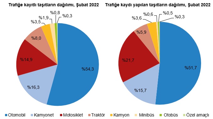 Şubat ayı sonu itibarıyla trafiğe kayıtlı taşıtların %54,3'ünü otomobil, %16,3'ünü kamyonet, %14,9'unu motosiklet, %8,0'ını traktör, %3,5'ini kamyon, %1,9'unu minibüs, %0,8'ini otobüs ve %0,3'ünü özel amaçlı taşıtlar oluşturdu.