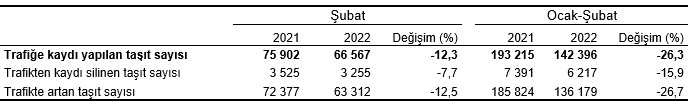 Ocak-Şubat döneminde bir önceki yılın aynı dönemine göre trafiğe kaydı yapılan taşıt sayısı %26,3 azalarak 142 bin 396 adet olurken, trafikten kaydı silinen taşıt sayısı %15,9 azalarak 6 bin 217 adet oldu. Böylece Ocak-Şubat döneminde trafikteki toplam taşıt sayısında 136 bin 179 adet artış gerçekleşti.